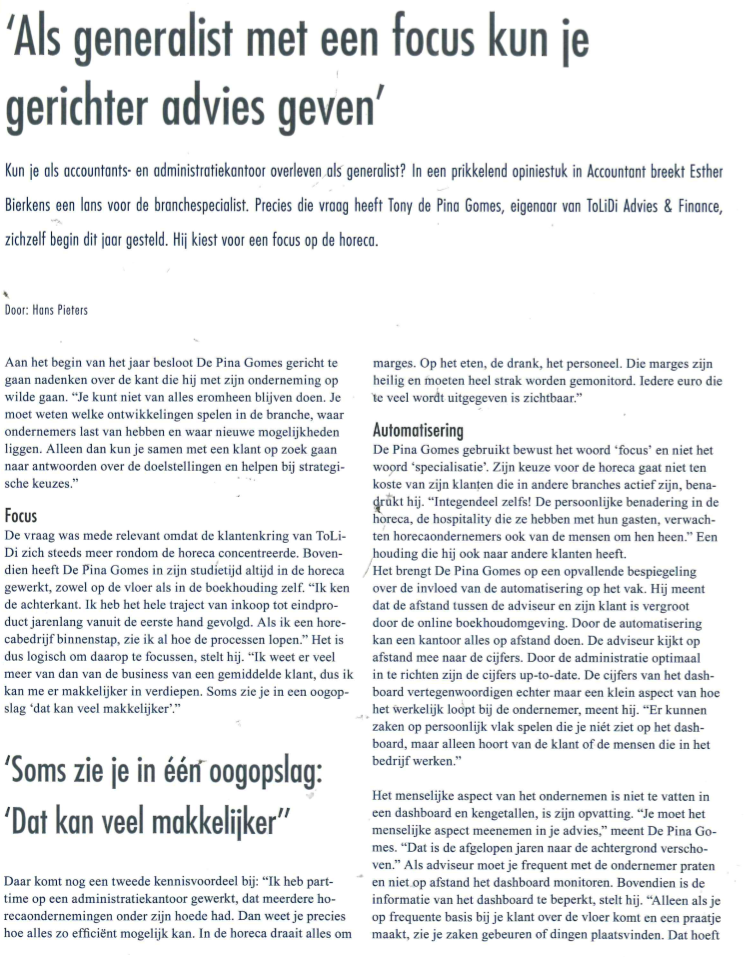 Kun je als generalist écht goed adviseren? Tony de Pina Gomes, eigenaar van ToLiDi Advies & Finance, dacht daar begin dit jaar nog eens goed over na. Zijn conclusie: gerichte focus maakt je sterker.